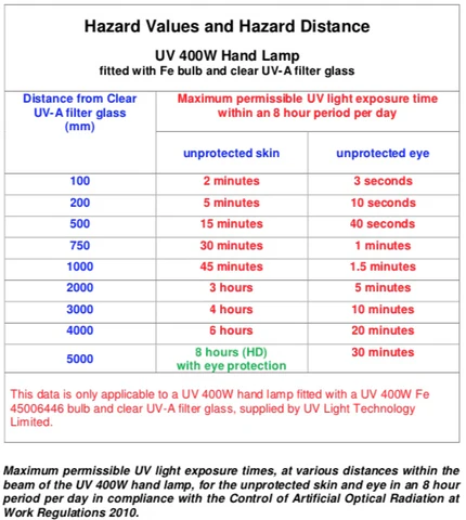 Sunlight comprises of 3 types of UV-light (different wave-lengths): A, B and C. Type C gets (mostly) filtered out by the ozone layer and B is the type that sunblock is used to protect against. Exposure to UV-A can be harmful and UV Light Technology Ltd work to the following times: