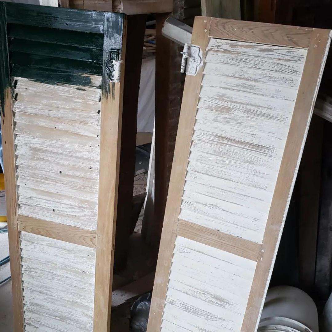 The shutters are painted in Brouns & Co Amsterdam Green. They are the original shutters and with linseed paint having been used years ago they only needed to be sanded back to the original linseed layers rather than completely stripped. The glazing putty was also replaced with Brouns & Co linseed oil putty and also painted in Amsterdam green.